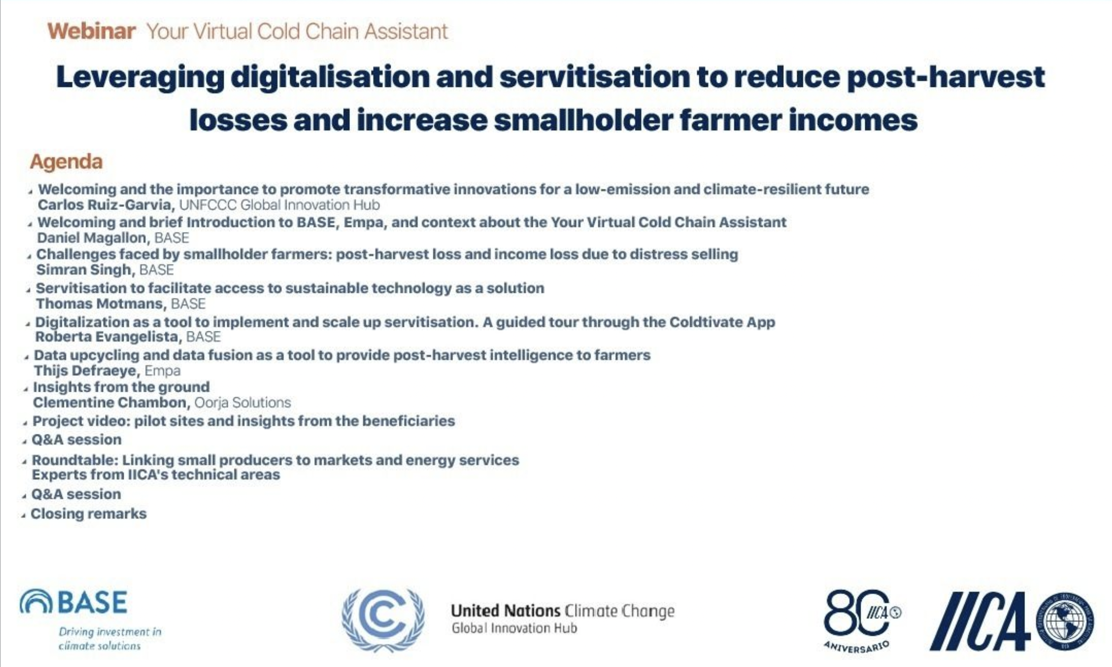 Your VCCA had the privilege of participating in a bilingual webinar hosted by the Instituto Interamericano de Cooperación para la Agricultura (IICA). The purpose of this event was to shed light on how servitisation and digitalisation can help effectively reduce food loss during the postharvest phase. Researchers from Empa and finance experts from BASE highlighted how these two strategic approaches can work in synergy, offering innovative solutions to address this pressing challenge in the agricultural sector. The panel was joined by Clementine Chamber, the co-founder of Oorja Development Solutions Limited. She shared Oorja’s experience and lessons learnt from implementing Your VCCA in their cold room in Muzaffarpur, Bihar, India.
