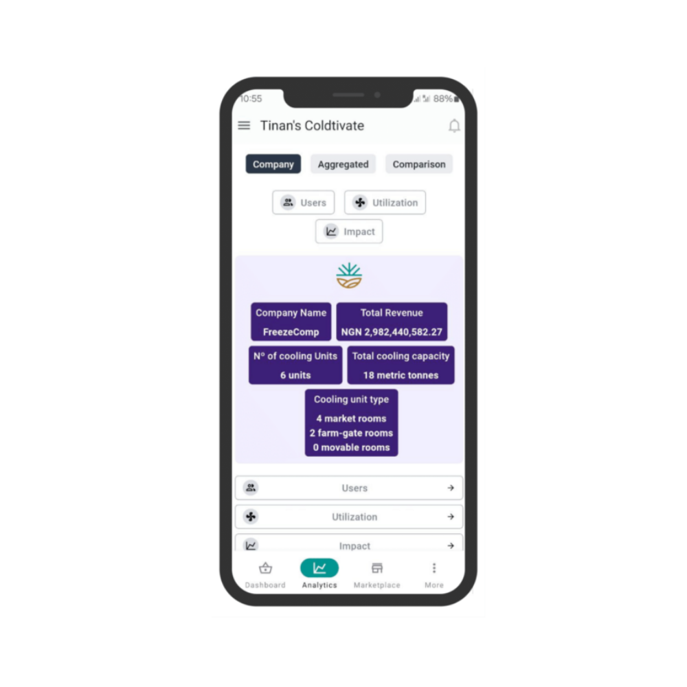Coldtivate Impact Dashboard allows cooling companies to track and compare room performance, monitor the impact of their intervention, and showcase the viability of their business. It includes information about the evolution of post-harvest losses and farmers' revenue, based on user-data, and environmental metrics on the emissions saved. The data is exportable, and is also visible by cooling users in the Farmers' Dashboard. The development of this feature has been supported by the Climate Ledger Initiative and the Swiss Agency for Development and Cooperation (SDC).